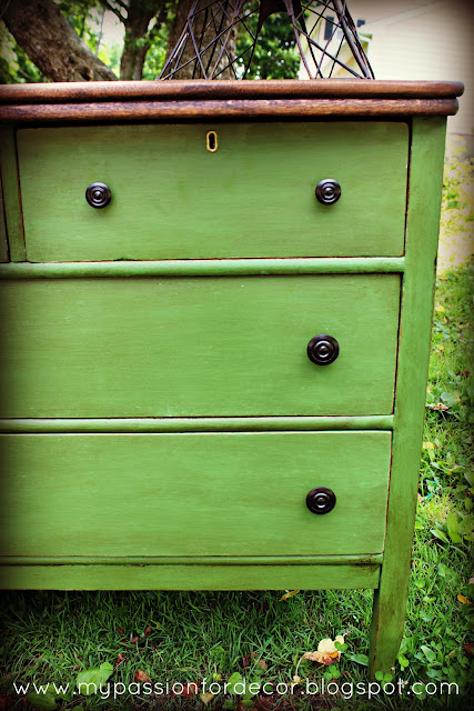 For a girl who doesn't really like green, I do love this shade of green.  I think it looks great with the dark brown stain on the top, plus the dark wax gives it a lot more depth.